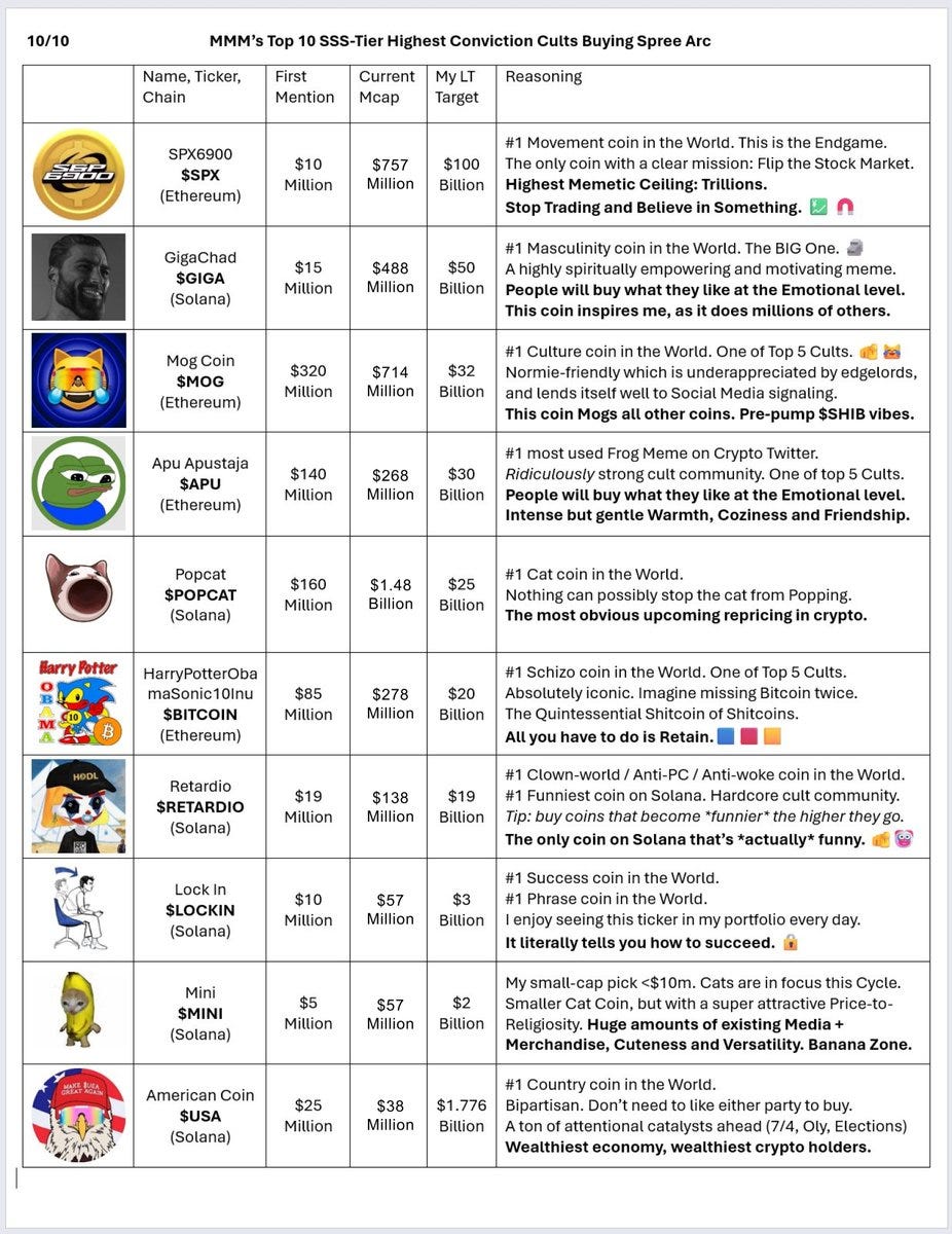 The best memes did 100x+, but it was mostly memes doing it over and over, rather than the larger memes moving to 10b+ valuations as I had originally thought. As a result, the positions I initially selected as best were – incredulously – not far out enough on the risk curve. The biggest performers since Mar. 1 include Brett, Popcat, Boden, and Giga. All assets that traded around 10m MC or below (or didn’t exist) on March 1st.