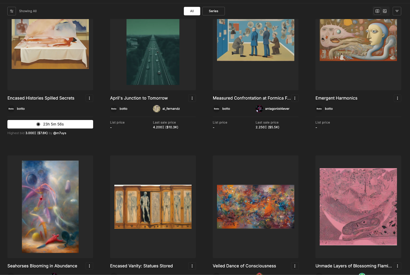 The old man in the group, Botto is an artist that’s been around since 2021. Botto takes tokenholder input in combination with its own models to come up with art pieces of a wide variety of styles. These pieces have consistently sold for $8k+ since 2021. With longstanding provenance and consistent demand spanning years, Botto has a cult of its own. What the valuation of arguably the first sovereign AI artist should be is an open question.