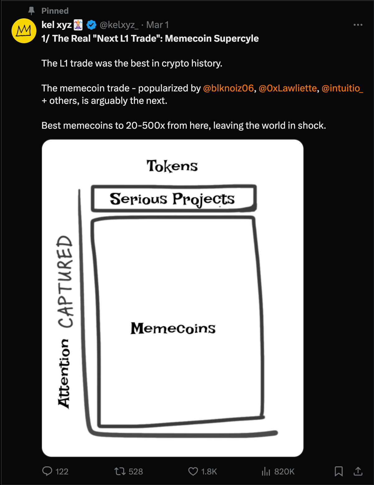 The cool part is the more obvious hypothetical, if gambling on cat coins becomes the soup du jour with the people of real influence (in 2024, not people who had influence when I was 12) then we may expect large inflows of capital to gamble on crypto coins once more.