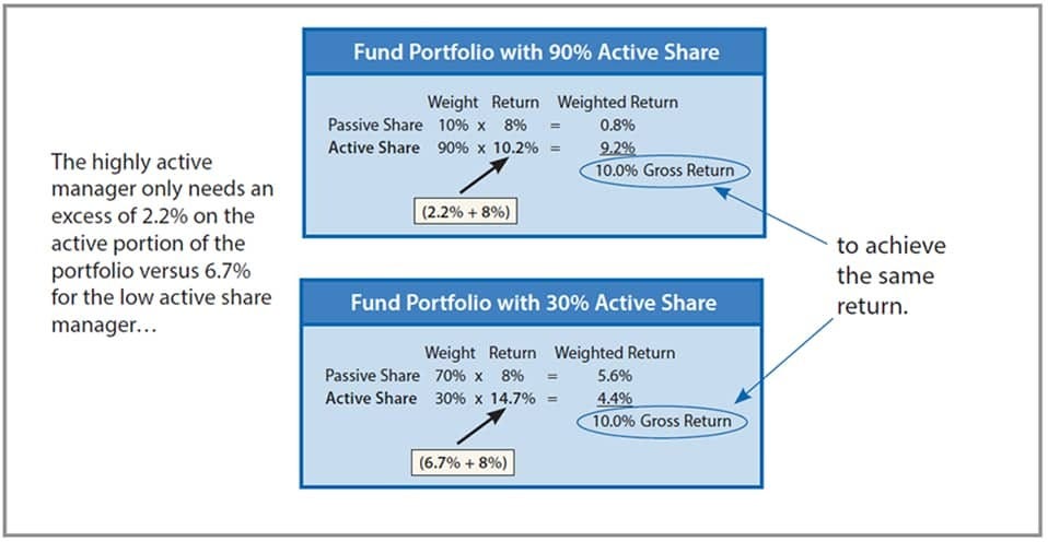 in this example, SOL would be considered a low active share position, while BSV would be considered high active share.