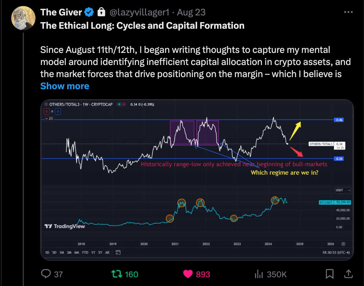 This portfolio construction offers some protection if alts continue down, perhaps on the back of a continued BTC downtrend (the echo bubble has topped view), while also offering exponential upside potential should alt markets recover (an extension of giver’s ethical long view).