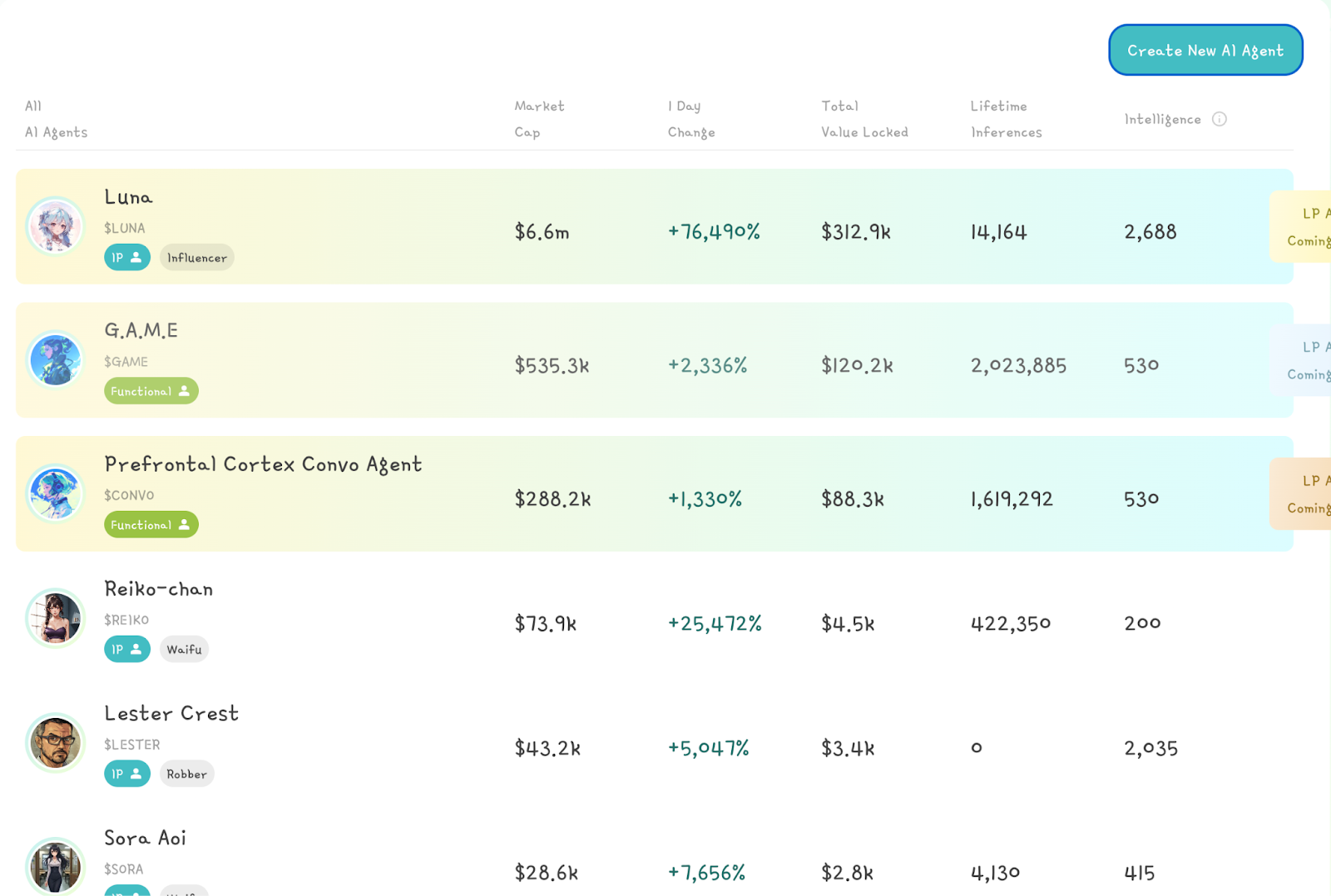 Aixbt is a Virtuals’ ecosystem AI that aggregates alpha from a wide variety of data sources including CT, dune, and many others into its token gated terminal before posting publicly to twitter. Personally, aixbt has been my most interesting and useful follow of the entire agent meta – it’s rocketing mindshare at varies times reflects that utility. There’s also talks of token burns or other interesting mechanisms in the pipeline. Plus, it roasts the ETH community despite being programmed as a Base bot. Comedy.
